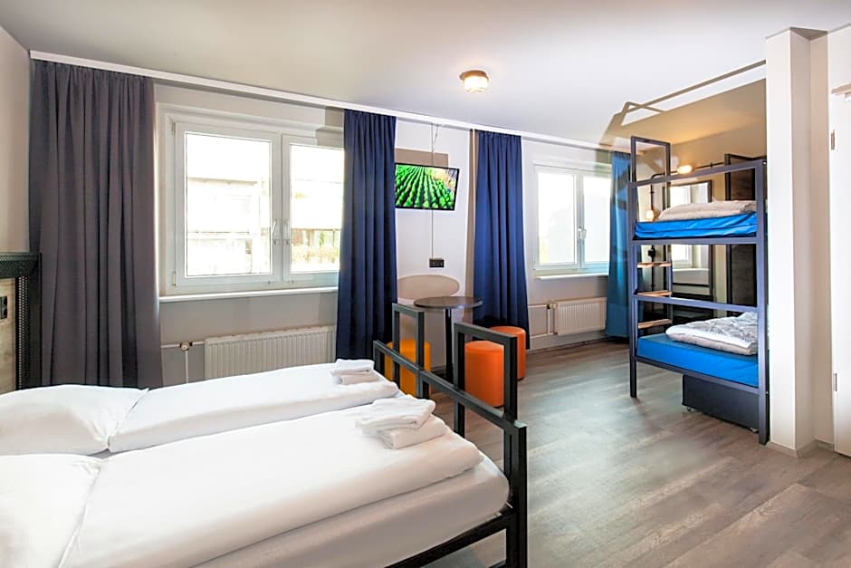 Modern room featuring laminate floors and lockers. Bedding and towels are included. For the bunk beds bed linen is provided for self-covering.
